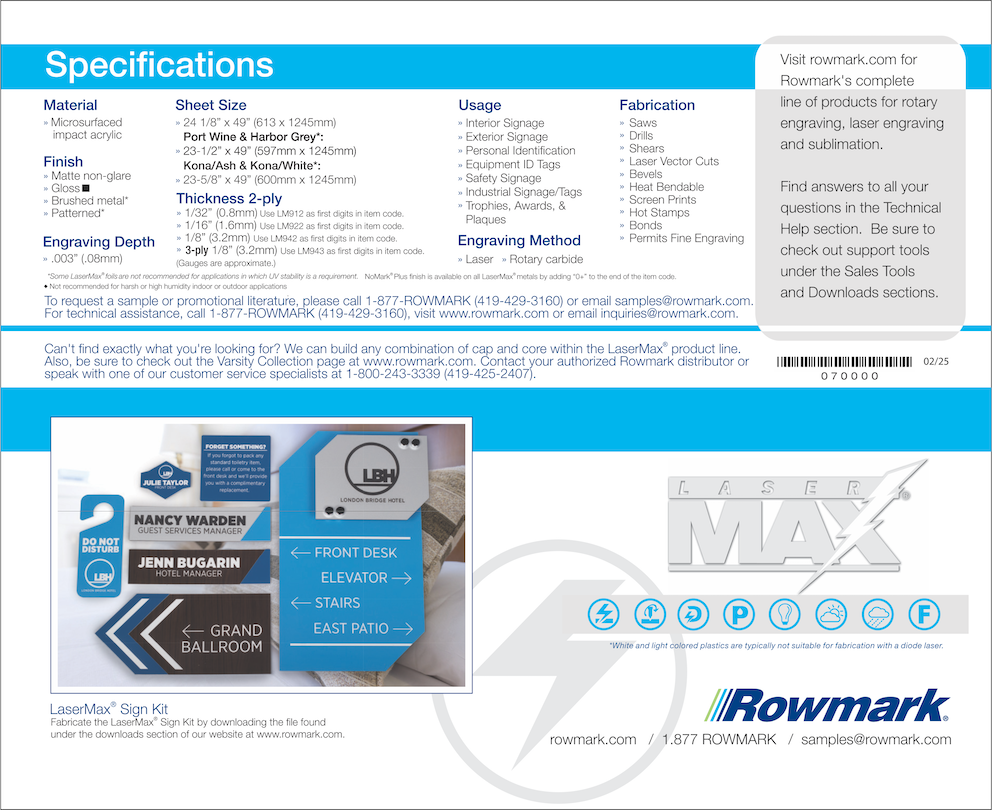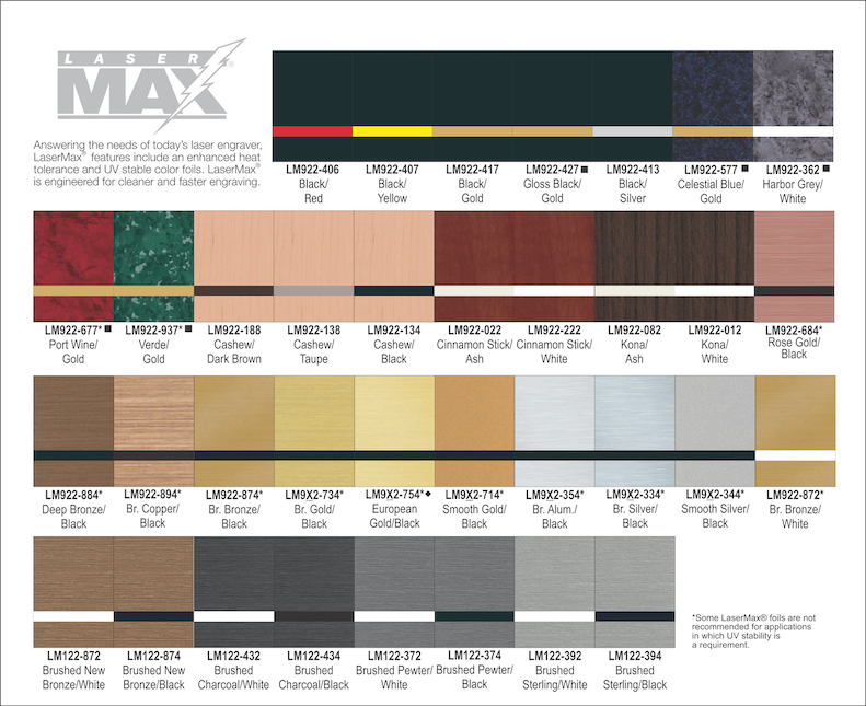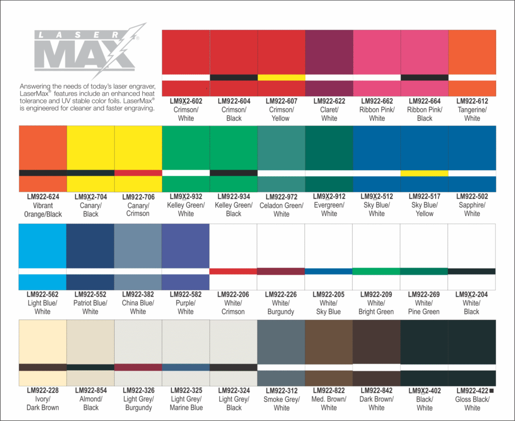 Your name should be built to the same quality as your product. We use materials that will withstand the harshest environments. Our standard tags are produced from Rowmark LaserMax two-ply plastic. It has been specifically developed for crisp, detailed engravings and the UV stability provides vibrance even after lengthy exposer to harsh weather conditions. With over 70 color combinations available, you are certain to find a combination that suits your application. We offer several standard sizes. We can also custom cut any shape or size to meet your need.